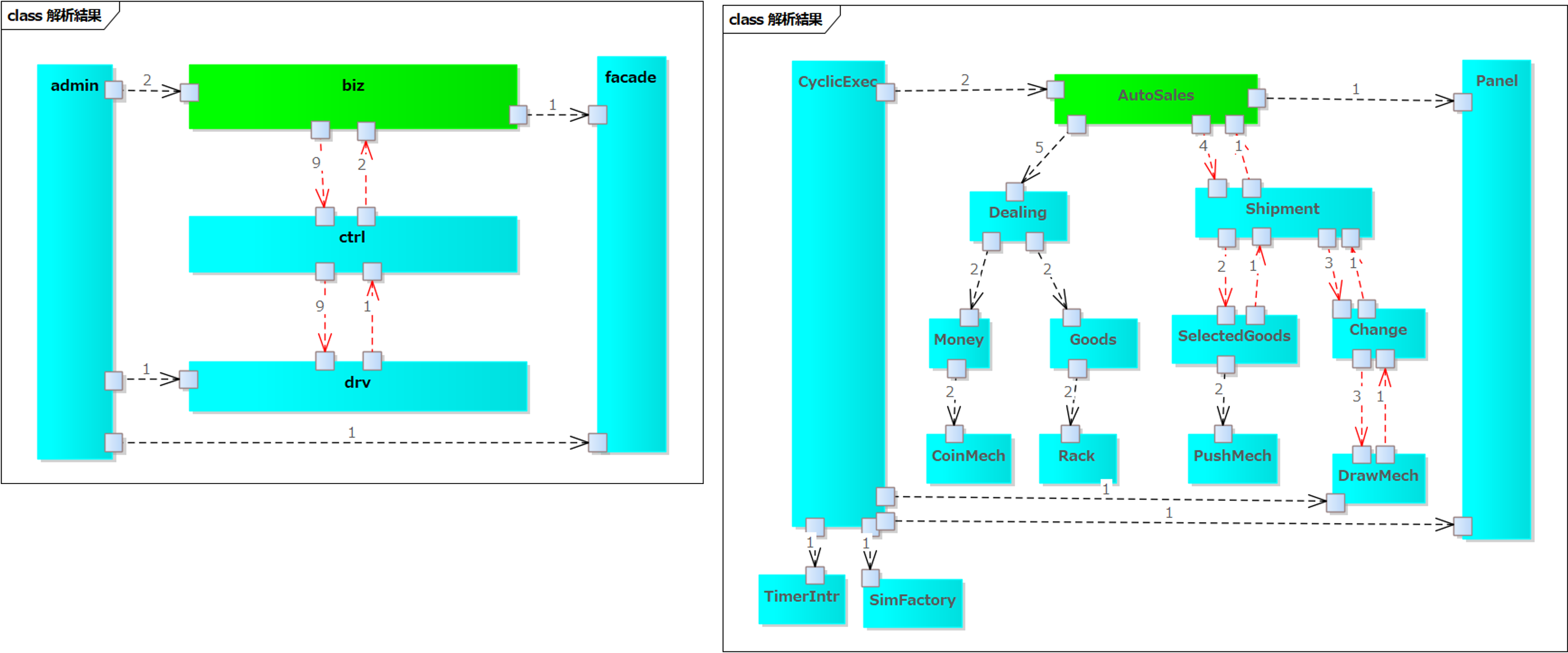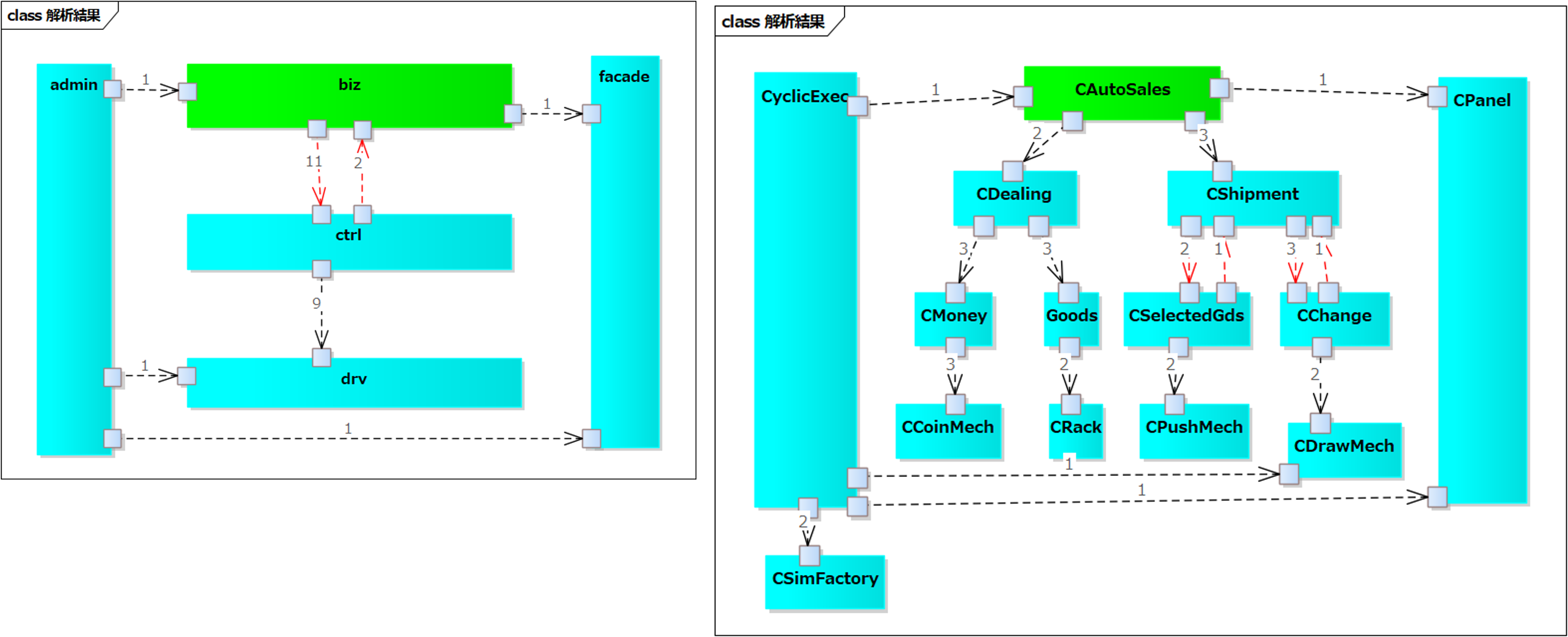 関数と変数の構造を設計し部品化(.hと.cのペア)したコードの図面です。 「販売(AutoSales)」が「取引(Dealing)」と「出荷(Shipment)」のサービスを使う、というレベル化の設計になっています。 構造化モデリング[静的]セミナーで習得できます。 C++での設計実装例こちらのソースコードを図面化してみます。 図面化したEAファイルです。 左側がコンポーネント構造図、右側がファイル構造図です。