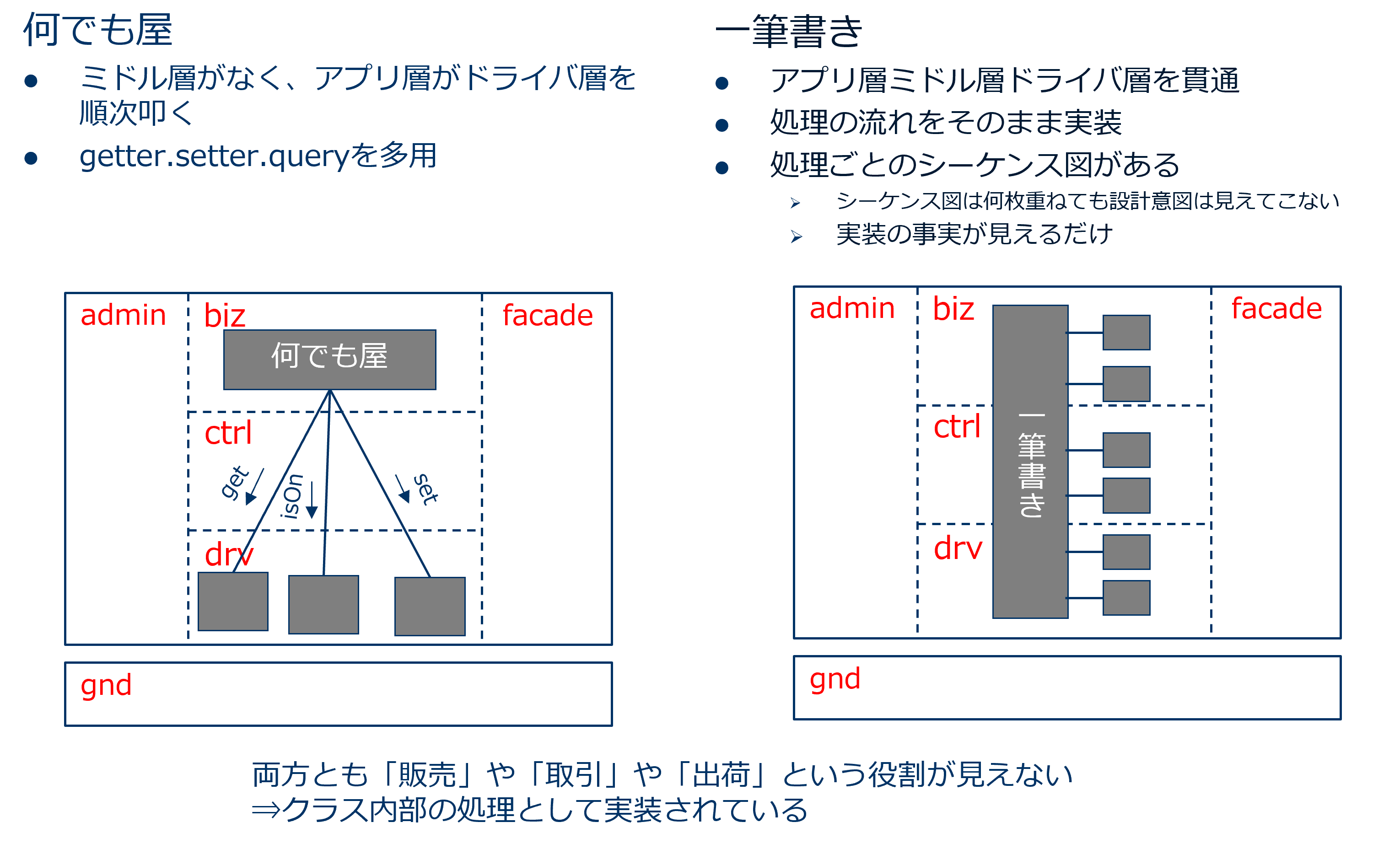 クラス設計してコミュニケーション図でメッセージ設計したコードの図面です。 オブジェクト指向モデリングセミナーで習得できます。 アーキテクチャ設計の失敗パターンよくあるアーキテクチャ設計の失敗パターンです。 コンポーネント単位での全体構造がアーキテクチャの静的ビューになります。 両方ともレイヤー化が壊れています。
