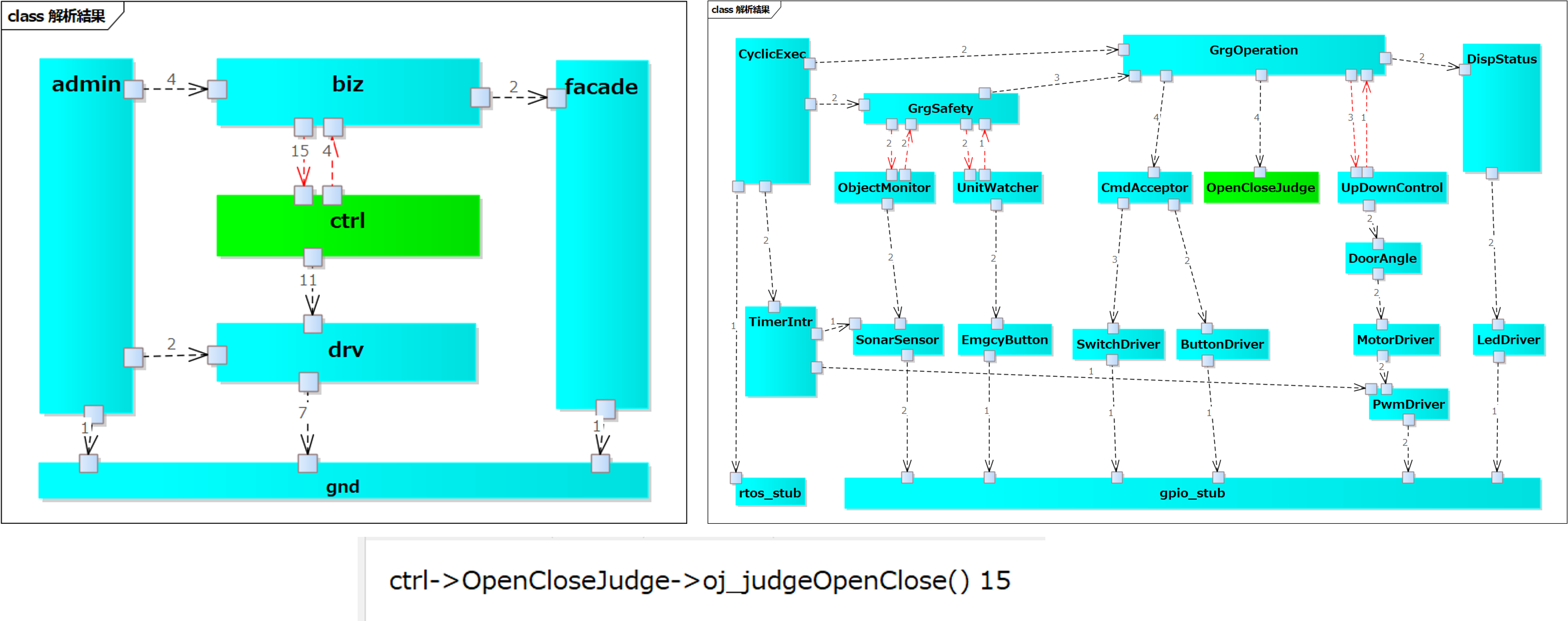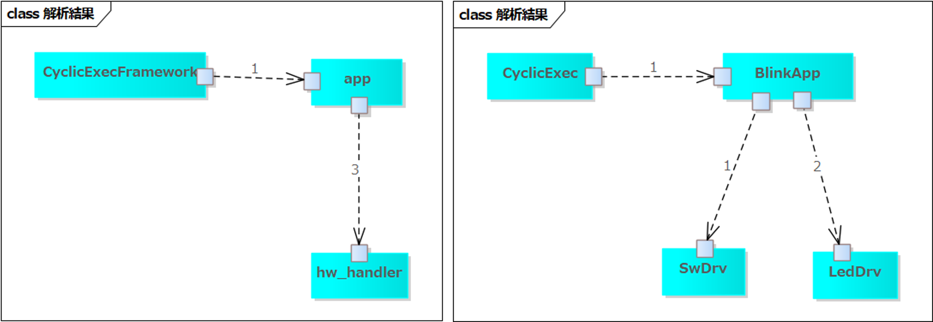 左側がネームスペース単位のコンポーネント構造図です。ネームスペースが未指定の場合はフォルダ名になります。 右側がクラス単位のファイル構造図です。今回の例では、アプリ層とドライバ層が直接関連していて、ミドル層が有りません。このまま大きくしていくと一筆書きコードになってしまうでしょう。 C/C++設計実装チュートリアルこのように書くと、このような図面が出ますという設計実装例です。 C言語の設計実装例こちらのソースコードを図面化してみます。 図面化したEAファイルです。 左側がコンポーネント構造図、右側がファイル構造図です。