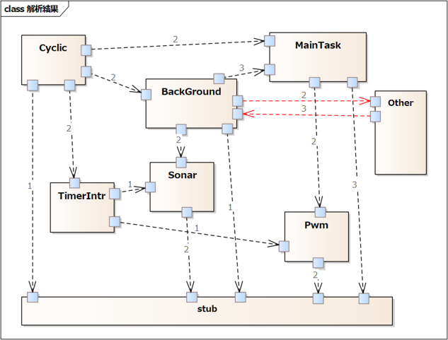 ファイルに"/* ATSTASK Main */とコメントすると、その単位で図面化します。 今回の例では、割込みから直接呼び出されているSonarとPwmが設計改善の対象になります。また周期実行で2つの周期が動いていることが分かります。 この例での設計実装PBLを提供しています。 新人研修での設計の意識付けや経験者の設計の再学習にお役立てください。 C++言語ソースコードの図面化こちらのソースコードを図面化してみます。 図面化したEAファイルです。 EAでのスケルトン生成からの図面化手順はこちらです。 静的構造図